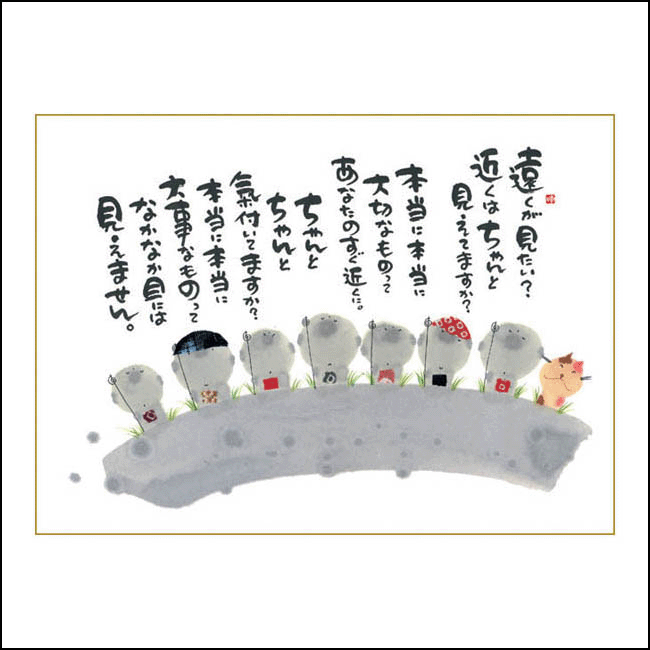 元気のないお友達に、あなたの気持ちをこの絵に込めて贈ってもいいし、がんばっている自分へのご褒美にいかがですか・・・ 【メッセージ内容】 「遠くが見たい? 近くはちゃんと 見えてますか? 本当に本当に 大切なものって あなたのすぐ近くに。