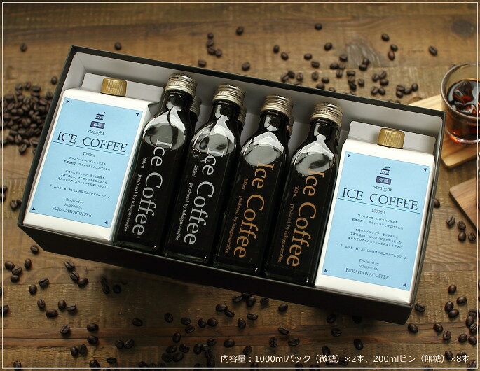 広島の人気コーヒー店・深川珈琲から、石焼焙煎のアイスコーヒーの無糖(200mビン)と微糖(1000mlパック)をセットにしたコーヒーギフトをお届けします。