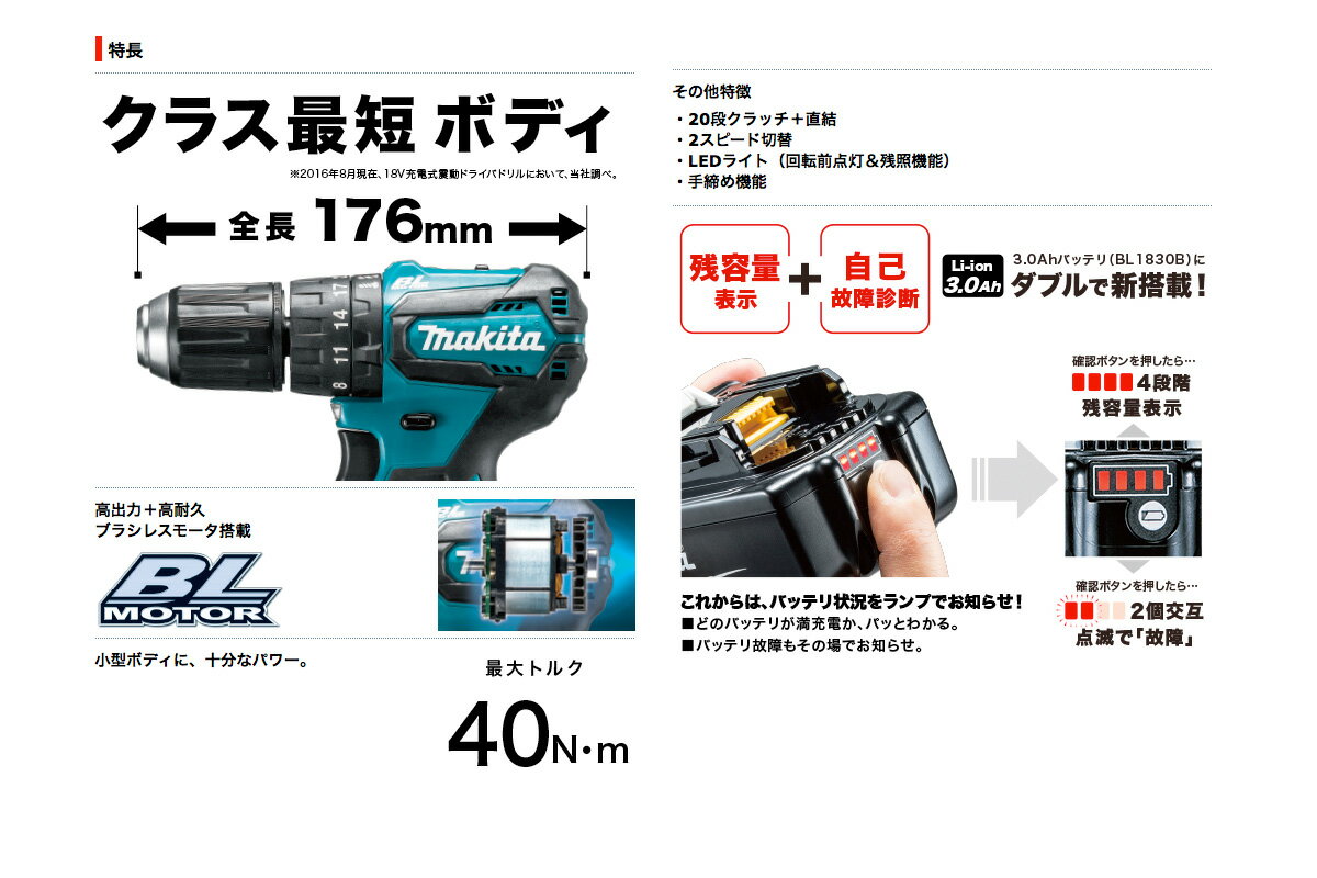 ■穴あけ能力:(コンクリート・ブロック)13mm、(鉄工)13mm、(木工)36mm ■ネジ締め能力:(木ネジ)径6.0×75mm、(小ネジ)M6 ■チャック能力:1.5〜13mm ■回転数[回/分]:(高速)0〜1,700、(低速)0〜500 ■打撃数[回/分]:(高速)0〜25,000、(低速)0〜7,500 ■全長:176mm ■質量:1.5kg(バッテリ含む) ■標準付属品:3.0AhリチウムイオンバッテリBL1830B×2台、充電器DC18RC、ケース、プラスビット2-65、フック